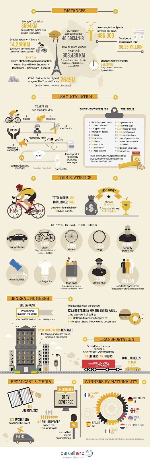 Here is an infographic containing all the facts and stats for this year’s Le Tour De France – explained in great detail with fun images. It lets you know how far team members ride, how much they eat, who covers the race, and who has won in the past. It’s nice to have such a complex event broken down in a well-balanced, interesting way.