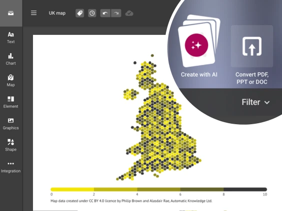 Infogram’s 800+ maps and simple tools let you build dynamic maps quickly. A data journalist can create a clickable election map, while a market researcher can plot customer locations, all without design skills. Import data from spreadsheets or PDFs, and add features like tooltips or animations. It’s fast, intuitive, and needs no coding.