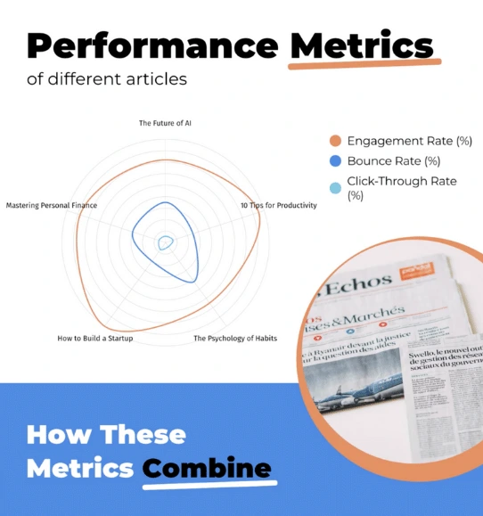 One of the standout qualities of radar charts is their adaptability across various fields and types of data, making them a valuable tool for professionals from different industries. Content writers, for example, can use radar charts to compare article performance metrics like engagement rate, read time, and share count, instantly seeing which topics resonate most with readers.