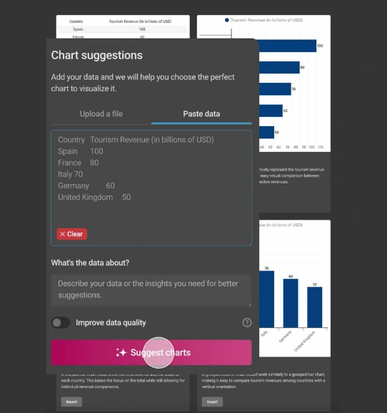 Diese Funktion vereinfacht den Prozess, indem sie Ihre Daten analysiert und die besten Diagrammtypen mit nur wenigen Klicks empfiehlt. Kopieren und fügen Sie einfach Ihre Daten ein oder laden Sie Ihre Daten-Tabelle hoch, und die KI schlägt die effektivsten Diagramme vor, um Ihre Informationen darzustellen.