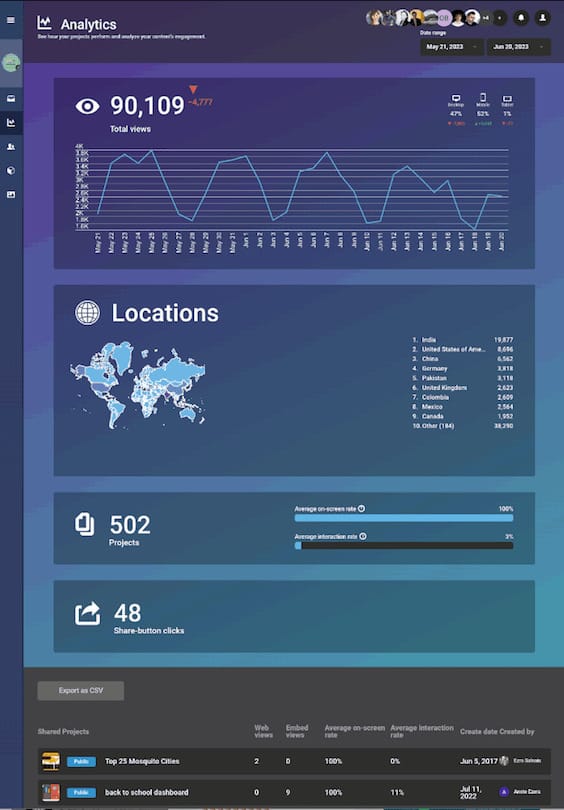 Gain valuable insights into your audience and enhance your content strategy with our robust analytics tool. With the Views and Viewer Demographics feature, you can delve deep into the performance of your Infogram content and understand not only the number of views but also the location by country of your viewers. This valuable information empowers you to tailor your content to better resonate with your target audience and maximize engagement.