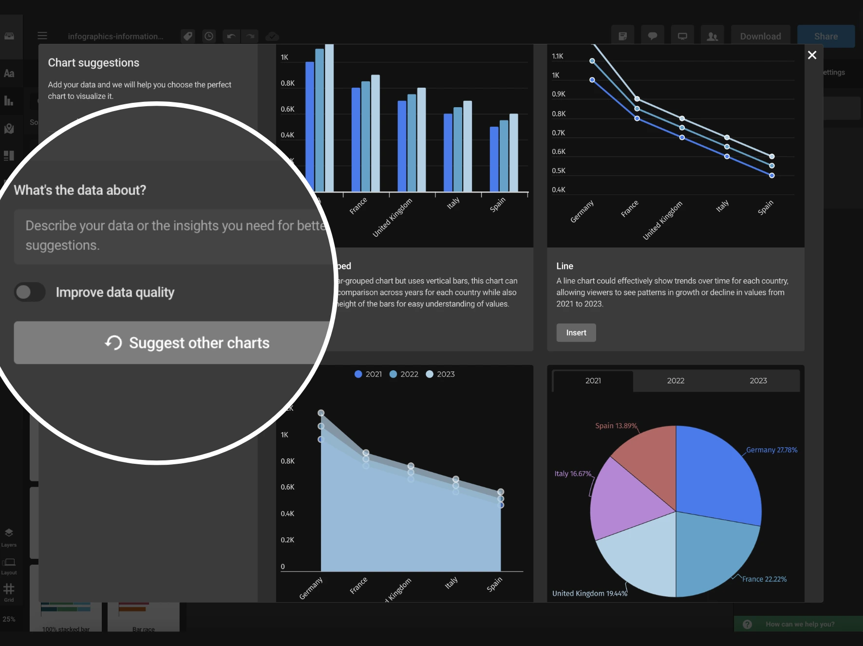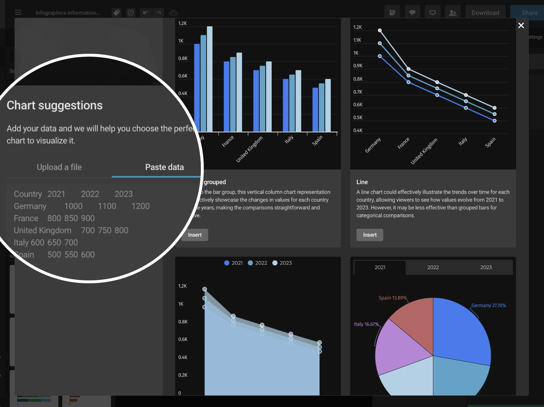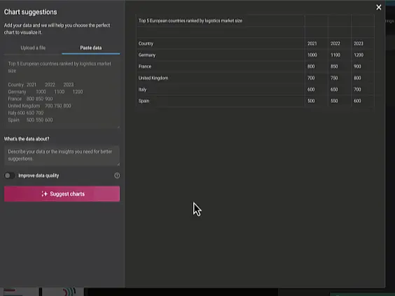 This feature simplifies the process by analyzing your data and recommending the best chart types with just a few clicks. Simply copy and paste or upload your data spreadsheet, and the AI will suggest the most effective charts to present your information.