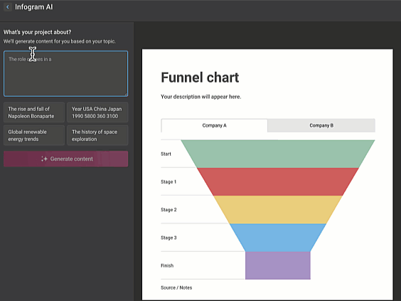 Absolument ! Le générateur de graphiques AI d'Infogram peut suggérer les types de graphiques les plus efficaces pour vos données. Il vous suffit de télécharger vos données, et l'IA recommandera les meilleures options de graphiques, garantissant que vos données sont présentées de la manière la plus percutante.