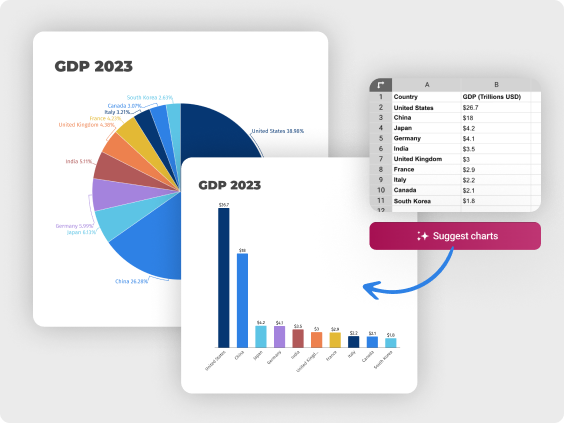 Importez des données depuis Excel, des bases de données ou des PDF, et laissez l’IA suggérer les meilleurs graphiques pour gagner du temps. Créez des tableaux de bord, cartes ou infographies qui mettent en lumière des tendances, comme la croissance des revenus ou les goulots d’étranglement opérationnels, et intégrez-les dans des présentations ou portails d’entreprise sans coder. Les visuels responsifs et auto-actualisés restent à jour sur tous les appareils.