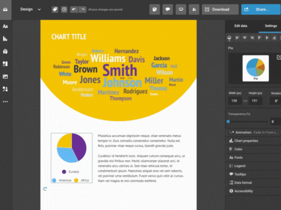 Avec plus de 35 types de graphiques et 800 cartes, l’IA d’Infogram suggère les meilleurs visuels, et l’importation depuis Excel ou PDF fait gagner du temps. Cette clarté aide les parties prenantes à comprendre rapidement les insights. Utilisez des infobulles personnalisées pour expliquer les métriques clés, même aux non-experts.